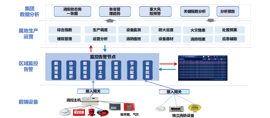 智能物联、感知预警:通过智能感知终端设备,实现建筑内火灾自动报警系统、消防水压/水位、电气火灾燃气、气体灭火、视频监控等系统数据实时在线,出现异常及时告警。