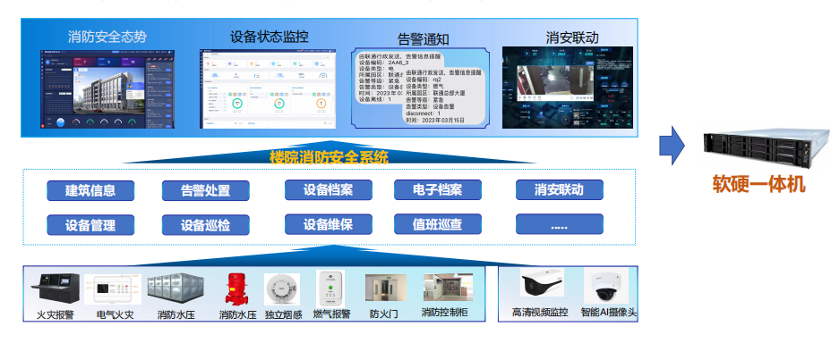 面向区县、园区、街道、楼院等中、小规模场景消防安全管控需求,打造轻量智慧消防平台,将主要消防系统联网并接入视频监控,实 时监测大楼内消防设备运行状态,消防告警通知责任人,通过消安联动提升核查效率,及时发现消防风险隐患。