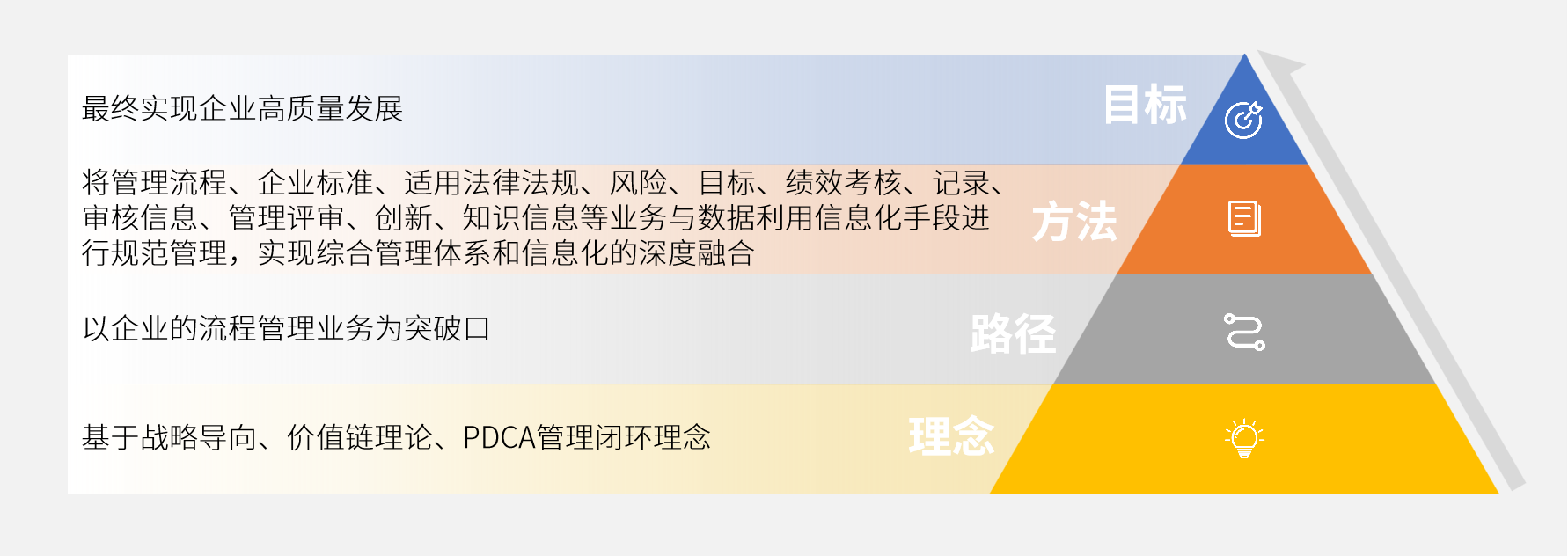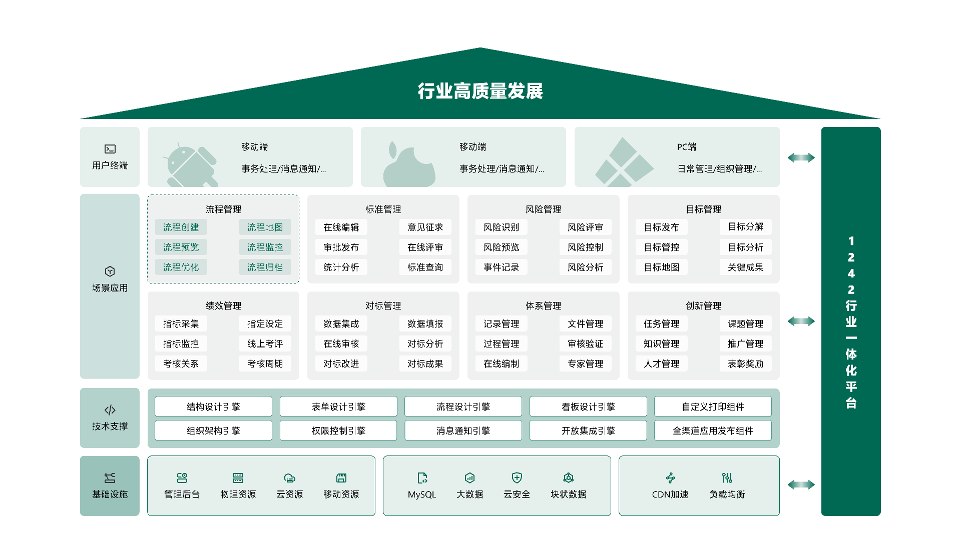 总体架构本着统一、标准、开放、可靠、易用、先进的设计原则,依托敏捷化和智能化建设思路, 以流程为核心,联结各管理要素和管理活动,打造全要素、全链路的企管一体化平台,面向企业内外部提供优质的数字化服务,进而实现与“1242行业一体化平台”互联互通。