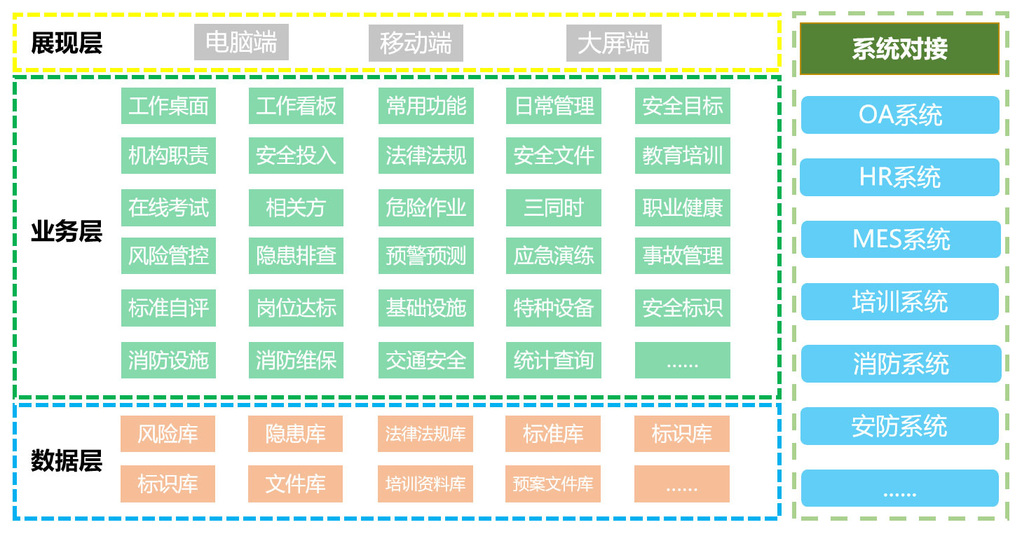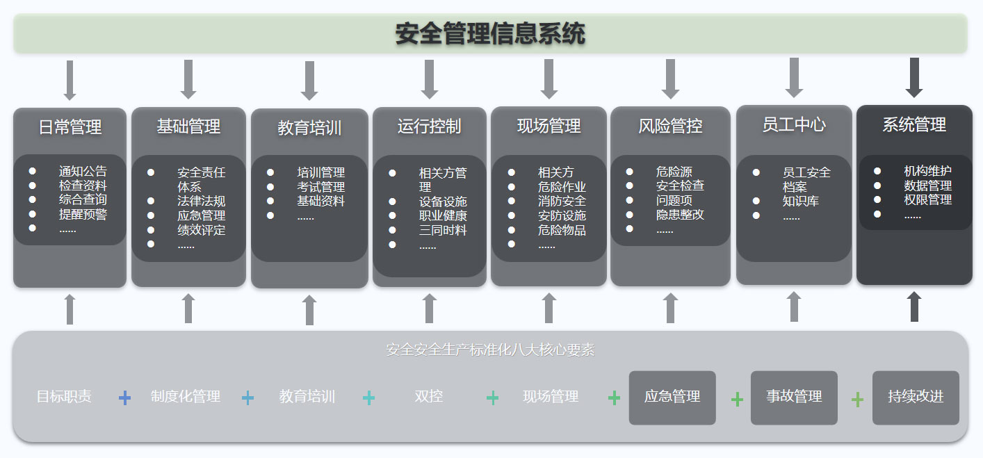 系统基于国家安全生产法律法规及行业标准要求建设,汲取先进思想,从安全管理本质出发,充分应用互联网、移动互联,实现企业安全生产全周期管控,深化业务管控流程、加快事后应急向事前预防、传统防治向信息预警的转变。通过标准化业务模块、全面风险管控机制、职责统一的工作流,全面的业务数据支撑、多维统计图表呈现,让企业安全状态可知可视。将现代化的工作方法引入企业管理中,利用信息化建设不断创新企业管理活动,为企业的长远发展奠定基础。所以,只有利用信息化推动企业朝着智能化和现代化的方向发展,才能在激烈的市场竞争中保持足够的竞争力。